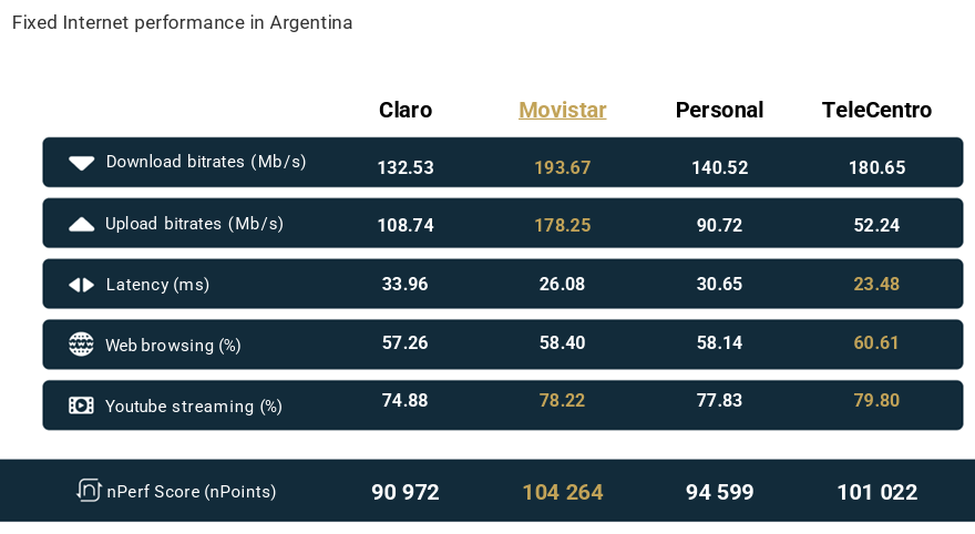 Movistar,en proceso de compra por parte de Telecom,mantuvo su posición de liderazgo con una puntuación general de 104,264. Presenta una velocidad de descarga de 196.6 Mbps y mantiene el primer puesto en velocidad de subida,con un aumento de 31% interanual hasta 178.2 Mbps.Telecentro mejoró sus resultados por quinto año consecutivo. Destaca en los indicadores de latencia (23.48 milisegundos) y navegación Web. Su velocidad de subida mejoró un 51% interanual.