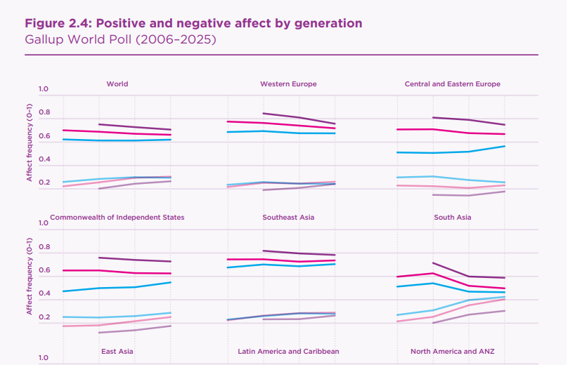 Este gráfico muestra la evolución de los afectos positivos y negativos por generación en distintas regiones del mundo entre 2006 y 2025,a partir de datos de Gallup. En términos generales,se observa una ligera caída en las emociones positivas (como alegría o satisfacción) y un aumento sostenido de las emociones negativas (como estrés o preocupación) en varias regiones,especialmente en América del Norte,Europa Occidental y algunas partes de Asia.