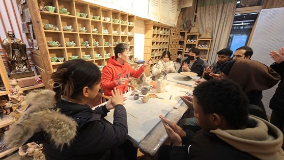 After experiencing the good products and traditional culture of Shandong and Jinan at the "Yellow River Fair,” the group of foreign friends arrived at the "He Weigui" Ceramic Sculpture Studio located in Huaiyin District, Jinan City. The studio is small, quiet, and has a simple and elegant style. It displays various ceramic sculptures, decorations, and utensils made by the inheritor of Jinan's intangible cultural heritage, Mr. Wang Lingtao. The most prominent displays are the large and small ceramic sculptures of Confucius with different styles, as well as the lifelike "72 Disciples of Confucius" clay sculptures, including Yan Hui, who enjoys poverty, Gongye Chang, who can speak to birds, and Zhong You, who accompanied Confucius on his travels around the country... These pieces left the foreign friends in awe and filled with praise. After the foreign friends arrived at the studio, Mr. Wang greeted them with a traditional Chinese bow greeting. He explained the development and craftsmanship of Chinese ceramics to the visitors. Finally, under the guidance of Mr. Wang Lingtao, the foreign friends experienced the techniques and cultural essence of making ceramic "Yuanbao.” They enjoyed a cultural feast that combined traditional culture with ceramic sculpture art.