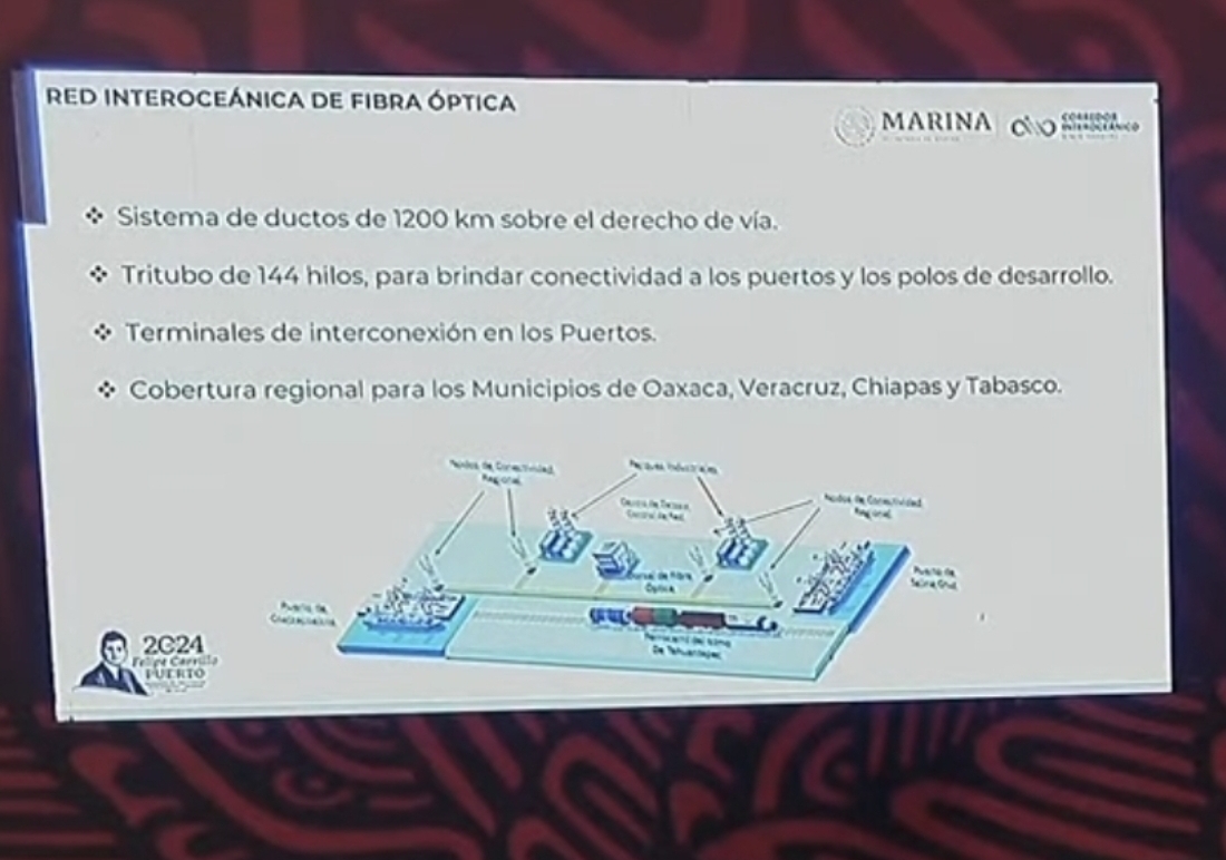 “Se van a construir mil 200 kilómetros de sistemas de ductos sobre el derecho de vía donde se van a instalar tritubos con 144 hilos de fibra óptica para dar conectividad a los puertos,a las estaciones del tren,y darle cobertura digital a los estados de Oaxaca,Chiapas y Tabasco a través de Internet para Todos,que dirige la CFE”,detalló el almirante Raymundo Morales Ángeles.