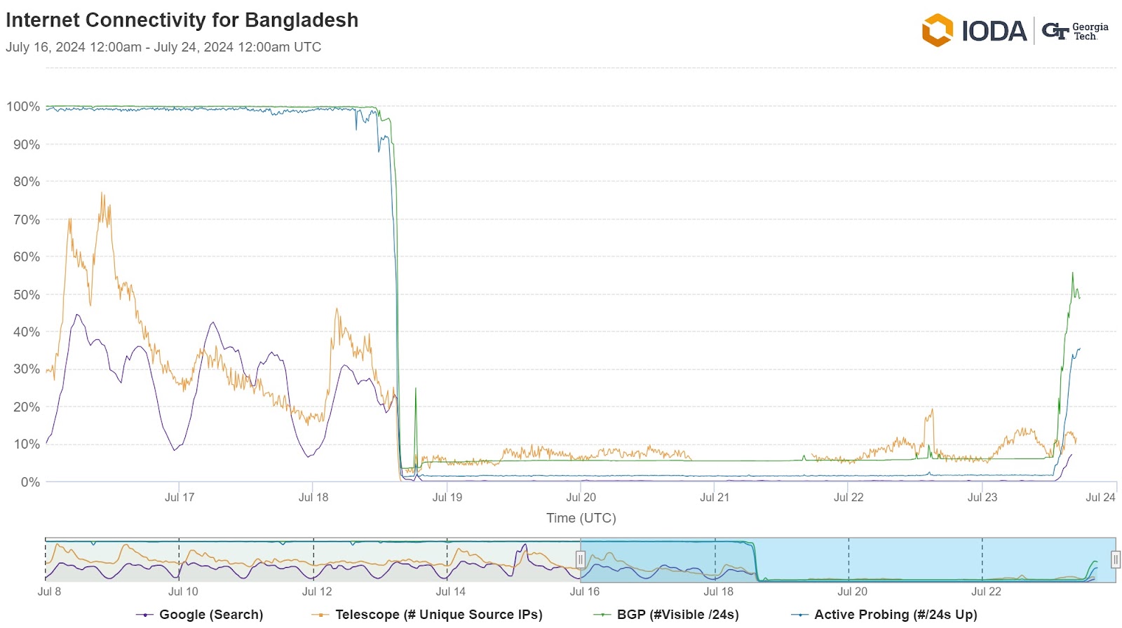 Conectividad en Bangladesh del 18 de julio al 24 de julio (12:00 am UTC). Gráfico: IODA