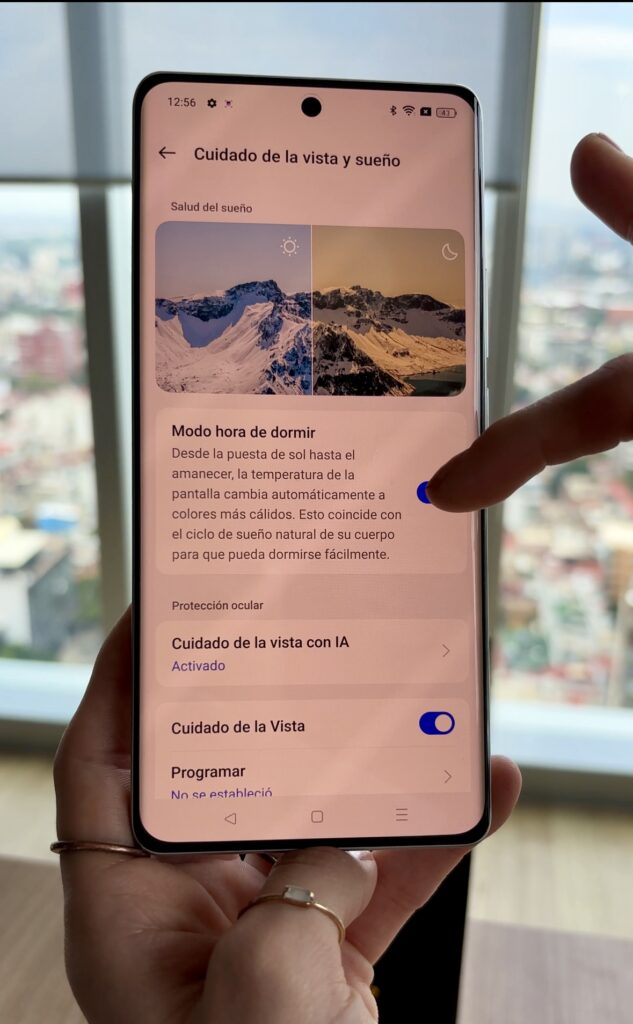 Al final del día,después de unas cuantas victorias y derrotas,es hora de cenar y prepararme para dormir. Mientras veo una película, la IA del dispositivo cuida mi vista ajustando el brillo de la pantalla automáticamente cuando detecta que estoy bostezando o que mis ojos se ven cansados.