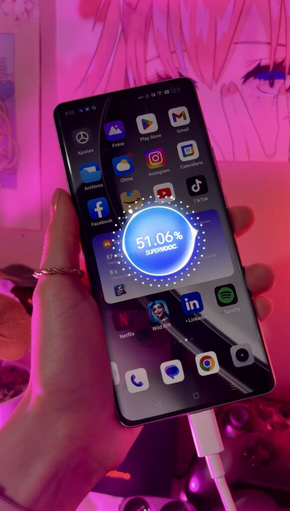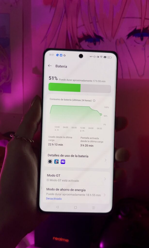 Tampoco me preocupa el tiempo de carga,porque con el cargador de 120W incluido,solamente necesito entre 10 y 15 minutos para tener el 50 por ciento de carga listo. La gran capacidad de la batería de 5500mAh del realme GT 6T me asegura que el teléfono me acompañará durante mucho tiempo sin necesidad de llevar una power bank o buscar un conector en la calle.