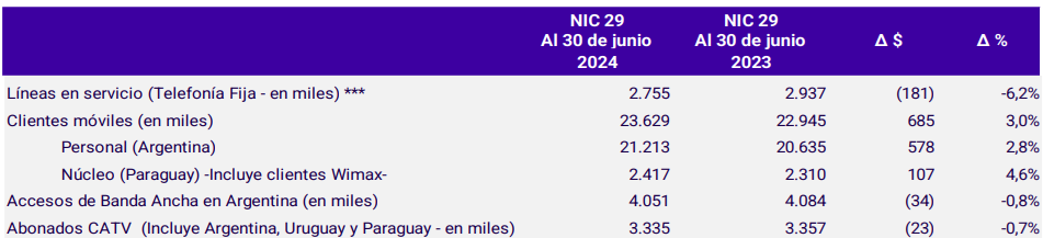 Telecom tiene 23.6 millones de líneas móviles,21.2 millones en Argentina y 2.4 millones en Paraguay). El total registrado es 3 por ciento mayor que hace un año como consecuencia de un alza en el segmento prepago que fue parcialmente eclipsada por una caída pospago. En tanto,hubo baja en las bases de telefonía fija,de banda ancha y de TV paga.