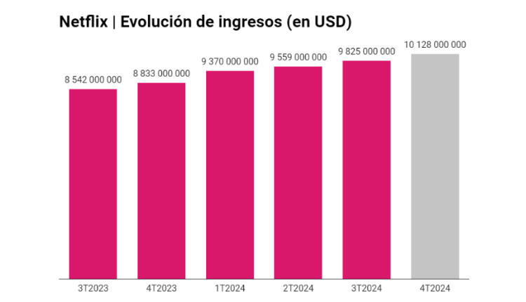 Netflix presentó ingresos por 9 mil 825 millones de dólares en el tercer trimestre de 2024,cifra 15 por ciento superior a lo informado un año atrás. La compañía vislumbra incluso mejores números para el cuarto trimestre: espera facturar más de 10 mil 128 millones de dólares,de la mano de más suscriptores por el comportamiento habitual de los consumidores y “una sólida lista de contenidos”.