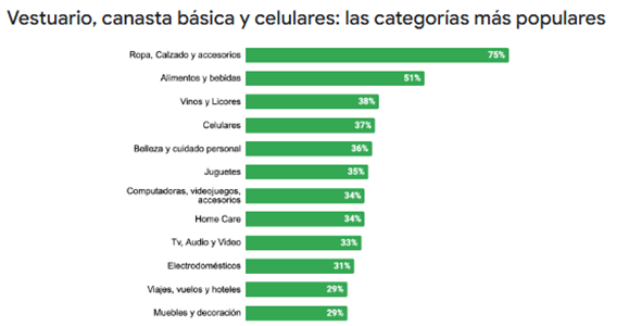 Para las compras de fin de año,las categorías más populares son ropa,calzado y accesorios con 75 por ciento,seguida por alimentos y bebidascon 51 por ciento,vinos y licores con 38 por ciento.