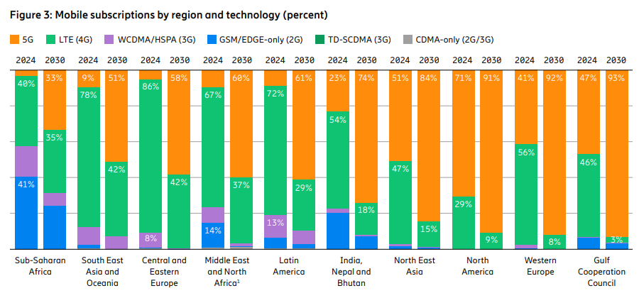 Sólo en América Latina,el reporte muestra que 4G sigue siendo la tecnología móvil dominante,pero ha comenzado a declinar ligeramente mientras los usuarios migran a 5G. Para finales de 2024,se estima que 4G representará el 72 por ciento de las suscripciones.