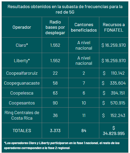 En tanto,Coopeguanacaste,Coopelesca,Coopealfaroruiz,Coopesantos y Ring Centrales de Costa Rica adquirieron frecuencias en las bandas de 700 MHz,26 GHz y 28 GHz parael despliegue a nivel regional.