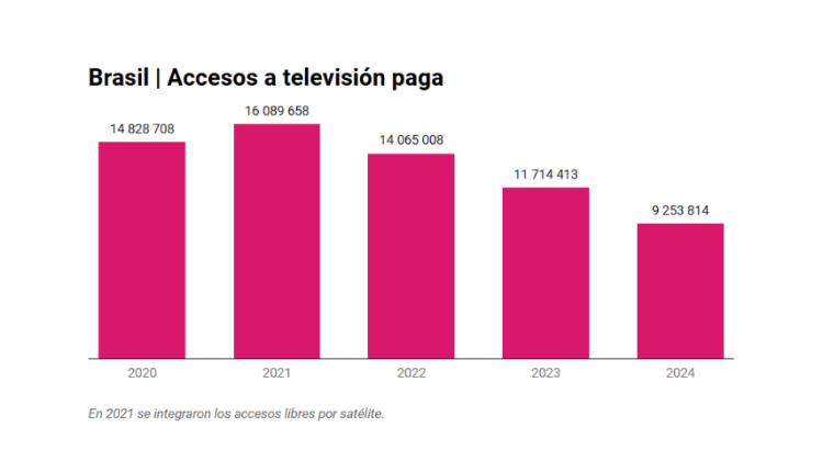 Una línea descendente se ha convertido en una tendencia que parece irreversible para la televisión de paga en Brasil: la base de suscriptores cayó 21 por ciento en 2024. La Agencia Nacional de Telecomunicaciones (Anatel) registró 9.25 millones de abonados al servicio,la cifra más baja de,al menos,los últimos 10 años.