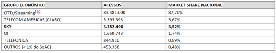 En abril pasado,el regulador reconoció que la televisión de paga y el streaming son el mismo mercado relevante. De acuerdo con el informe,que se lanzó como argumento de la respuesta positiva a la medida cautelar solicitada por Sky para dejar de tener obligaciones adicionales como empresa con Poder de Mercado Significativo,los OTT en conjunto son responsables del 87 por ciento del mercado de contenidos brasileño.