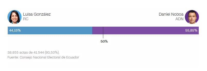 Con un total de 55.85 por ciento de los votos,de acuerdo con el Consejo Nacional Electoral (CNE),Daniel Noboa fue reelegido como presidente de Ecuador y ocupará el cargo hasta 2029, tras las elecciones de segunda vuelta. Su opositora,Luisa González,obtuvo el 44.15 por ciento y tras su derrota exigió una “investigación inmediata e independiente” sobre una serie de supuestas irregularidades que habrían desembocado en un fraude electoral.
