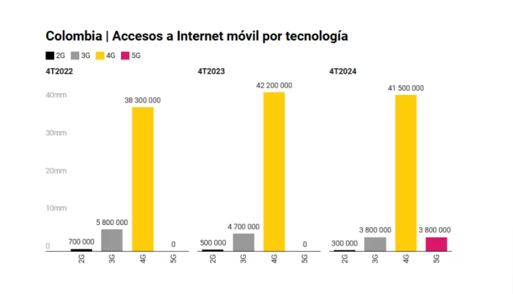Colombia cerró 2024 con 3.8 millones de accesos a Internet móvil 5G. La cifra es igual que el número de accesos 3G y sensiblemente,más de 10 veces,más alta que 2G. En tanto,4G se mantiene como tecnología dominante en el país. 5G tuvo un crecimiento de 37 por ciento sólo en el último trimestre del año pasado y ahora representa el 7.6 por ciento de las conexiones de este tipo.