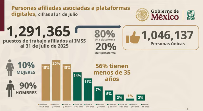 De acuerdo con los datos del IMSS presentados por Robledo,56% de quienes trabajan en las plataformas de transporte y reparto de comida y productos tienen menos de 35 años de edad,con una mayor proporción de hombres (90%) frente a las mujeres trabajadoras (10%).