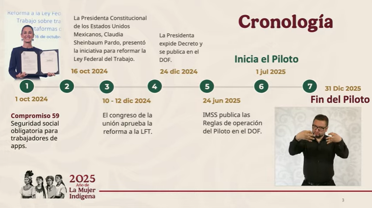 La implementación del piloto del IMSS es resultado de la reforma laboral en materia de plataformas digitales que se aprobó en diciembre de 2024. La reforma adicionó un capítulo especial en la Ley Federal del Trabajo,en donde se reconoce a los repartidores y conductores de aplicación como trabajadores de las plataformas.