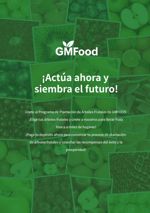 El programa de GMFOOD te permite ser socio, poseer un árbol frutal y disfrutar de grandes ganancias por la venta de frutas. Aprovechamos el mercado global: en 2024, las exportaciones agrícolas de México alcanzaron 254 mil millones de dólares, y en 2025 la demanda crecerá, elevando precios. GMFOOD vende tus frutas en EE. UU., China y Rusia, con ganancias del 300% al 1500%.